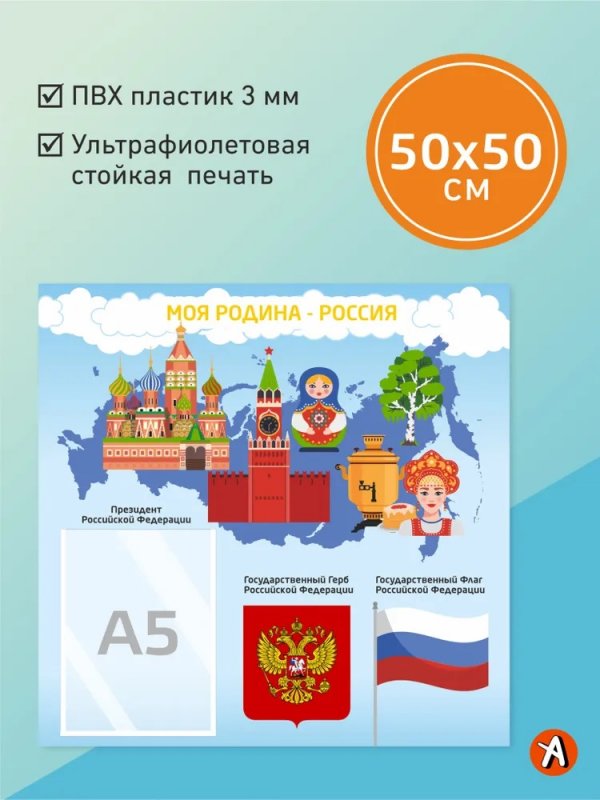 Изготовлен из ПВХ пластика 3мм, изображение нанесено напрямую на пластик, что значительно продлевает срок службы стенда в отличие от стендов, у которых сверху на пластик нанесена плёнка. Размер 50х50см 1 карман для информации формата А5 для фото Президента Российской Федерации.