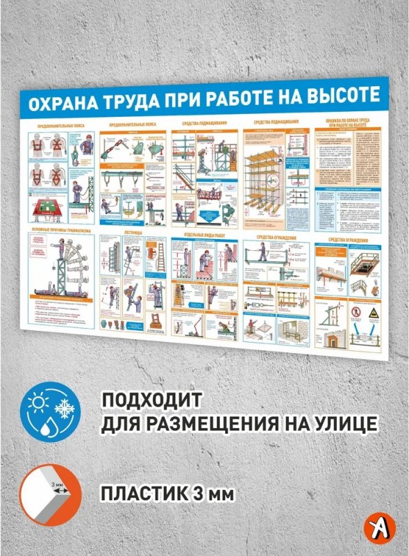 Информационные блоки стенда: 1. Предохранительные пояса — виды и правила использования средств индивидуальной защиты. 2. Средства подмащивания — требования к подмосткам и строительным конструкциям. 3. Правила по охране труда при работе на высоте — обязательные меры безопасности. 4. Основные причины травматизма — распространённые ошибки и способы их предотвращения. 5. Лестницы — правила безопасной эксплуатации лестничного оборудования. 6. Отдельные виды работ — особенности организации и проведения высотных работ. 7. Средства ограждения — применение ограждений для предотвращения падений.
