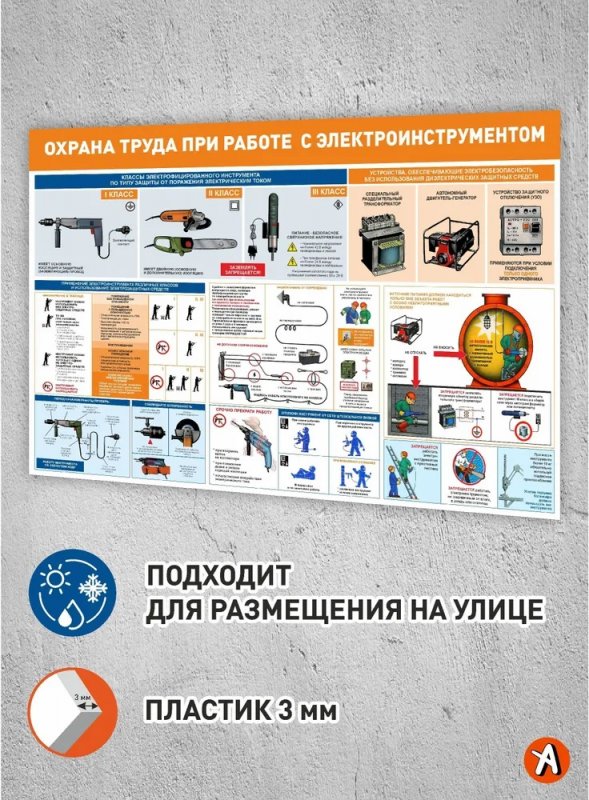 Информационные блоки стенда: 1. Классы электрофицированного инструмента — описание и классификация электроинструментов для безопасного использования. 2. Устройства, обеспечивающие электробезопасность без использования диэлектрических защитных средств — современные решения для повышения безопасности. 3. Применение электроинструмента различных классов и использование электозащитных средств — рекомендации по выбору и эксплуатации электроинструментов с учетом классов защиты. Этот стенд поможет обеспечить безопасность на рабочих местах, повысить осведомленность сотрудников о правилах обращения с электроинструментом и минимизировать риски травматизма.