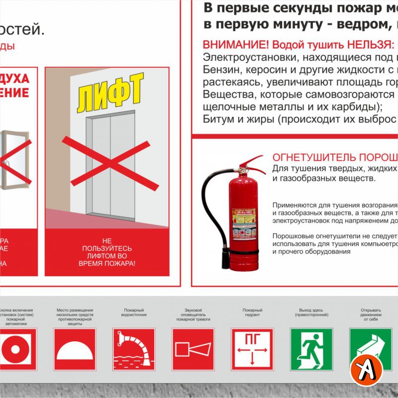 Кроме того, на нем размещена информация о первичных средствах пожаротушения, которые должны быть в каждом здании, и советы по эффективному тушению огня.