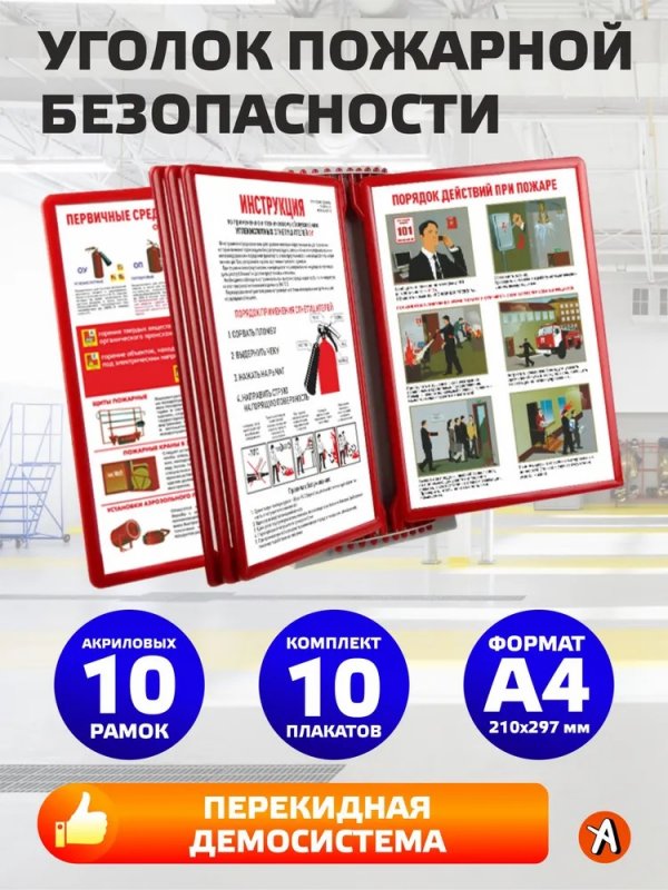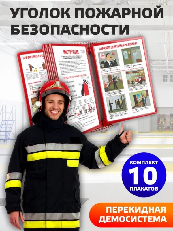 Уголок пожарной безопасности с 10 плакатами по пожарной безопасности в перекидном устройстве