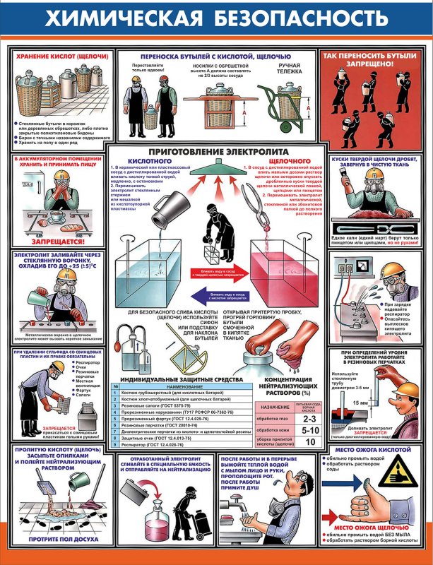 На плакате изображены правила безопасности при работе с щелочами и кислотами. Хранение кислот (щелочи). Переноска бутылей с кислотой, щелочью. Приготовление кислотного и щелочного электролита. Индивидуальные защитные средства. Таблица концентрации нейтрализующих растворов в процентах %. Техника безопасности при работе с щелочами. "