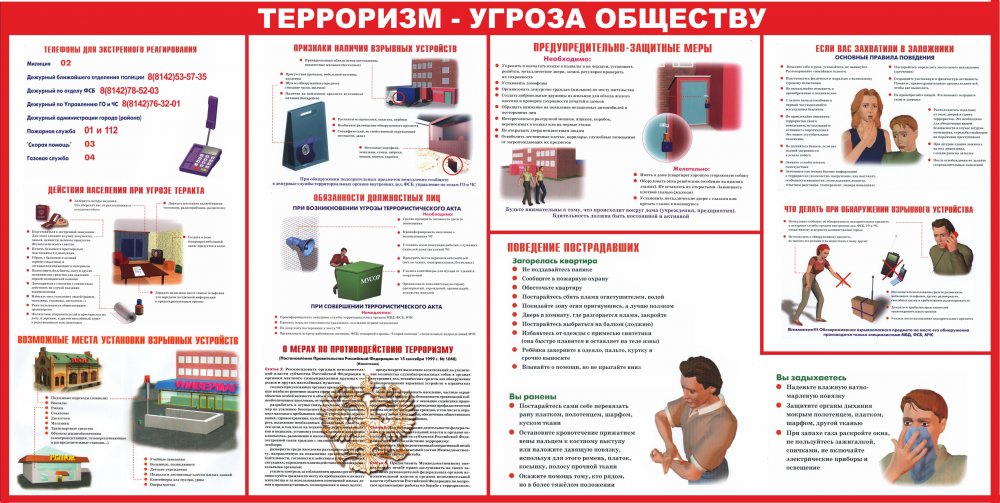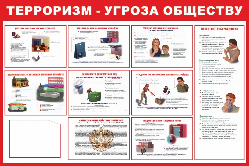 Стенд "Терроризм - Угроза обществу", на выбор размеры 1400х700 мм (пластик 3 мм), и 1500*1000 мм (пластик 5 мм) с карманом (карман А4, плоский). Стенд содержит информацию о мерах по противодействию терроризму. Действия населения при угрозе терракта, меры населения по противодействию терроризма.
