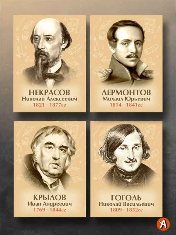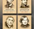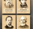 Комплект включает портреты таких знаменитых авторов, как Лермонтов, Чехов, Пушкин, Толстой, Гоголь, Тургенев, Некрасов и Крылов.
