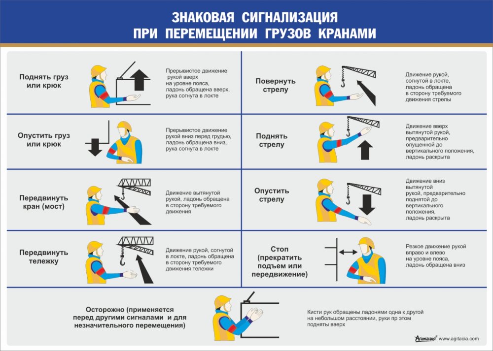 На стенде изображены правила знаковой сигнализации при перемещении грузов кранами.