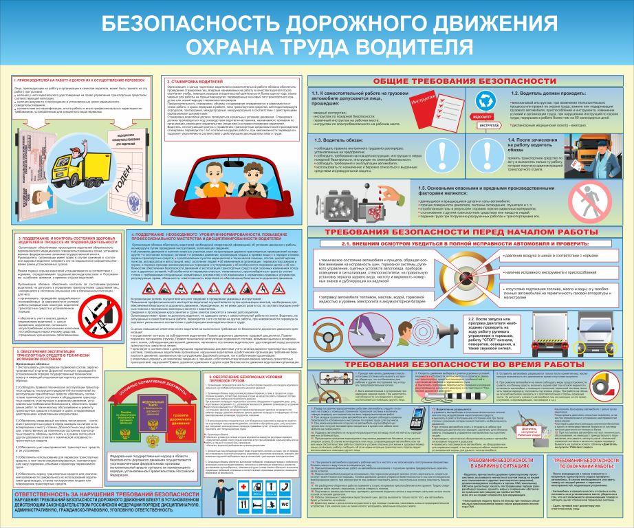 На стенде изображена безопасность дорожного движения и охрана труда для водителей