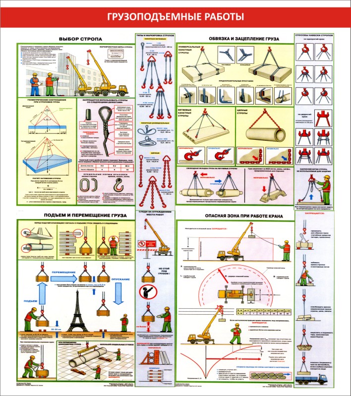 Выбор стропыОбвязка и зацепление грузаПодъем и перемещение грузаОпасная зона при работе крана     |  |