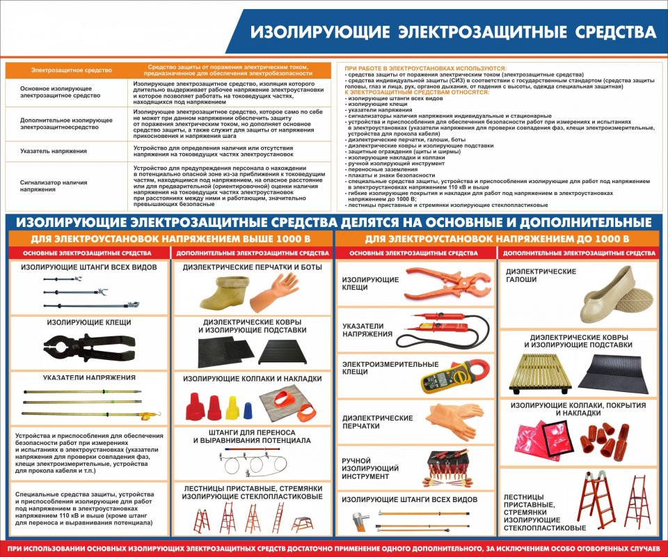На стенде изображен полный перечень изолирующих электрозащитных средств для электромонтажников