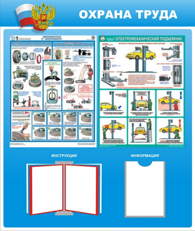 На стенде изображена техника безопасности для шиномонтажа и шиноремонта, техника безопасности при работе на электромеханическом подъемнике