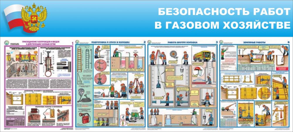 На стенде изображена техника безопасности при работе в газовом хозяйстве: