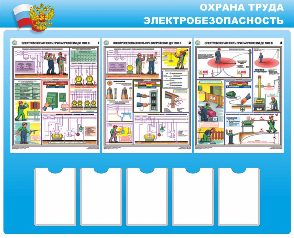 На стенде изображена информация по электробезопасности пр напряжении до 1000 В.