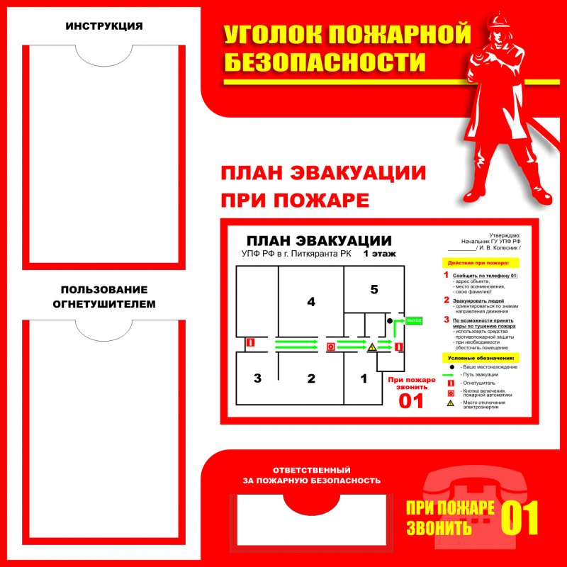 Стенд "Уголок пожарной безопасности" 800х800 мм, пластик 3 мм. Карман для размещения плана эвакуации 600х400 мм, 2 объёмных кармана А4 под инструкции, 1 плоский карман под ответственного за пожарную безопасность.