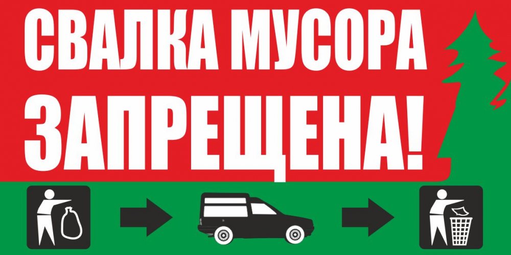 На аншлаге изображена надпись «Свалка мусора запрещена!» на фоне схематичного изображения елового леса и знаков предписывающих собрать мусор и вывезти его в специально отведенные для этого места.