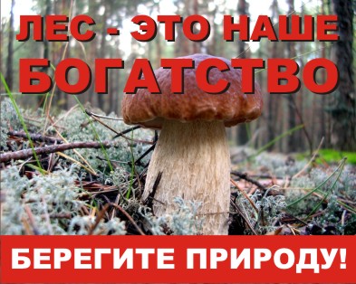 На аншлаге изображена надпись «Лес - это наше богатство. Берегите природу!»на фоне растущего в лесу белого гриба.
