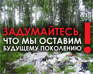 На аншлаге изображена надпись «Задумайтесь, что мы оставим будущему поколению!» на фоне оставленного в лиственном лесу мусора.
