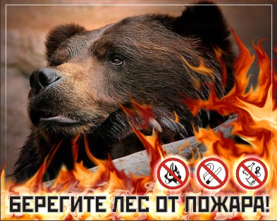 На аншлаге изображена надпись «Берегите лес от пожара!». В качестве фона - изображение медведя и пылающего огня.