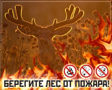 На аншлаге изображена надпись «Берегите лес от пожара!» на фоне оленя в цветущем поле и языков пламени.