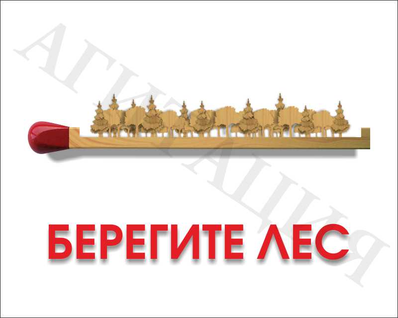 На аншлаге имеется надпись «Берегите лес» и изображение расположенной горизонтально спички с произрастающим на ней смешанным лесом, выполненными в единой цветовой гамме.