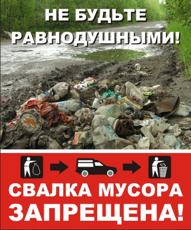 На аншлаге имеется надпись «Не будьте равнодушными! Свалка мусора запрещена! » на фоне мусора, оставленного на обочине дороги.