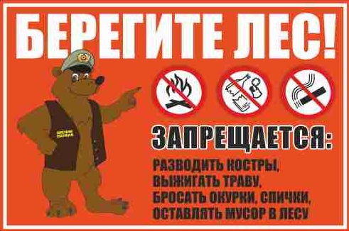 На аншлаге изображен мультипликационный медведь в жилетке и форменной фуражке, указывающий на плакат с надписью «Берегите лес» и знаки. запрещающие разведение костра, курение и выброс мусора на красном фоне.