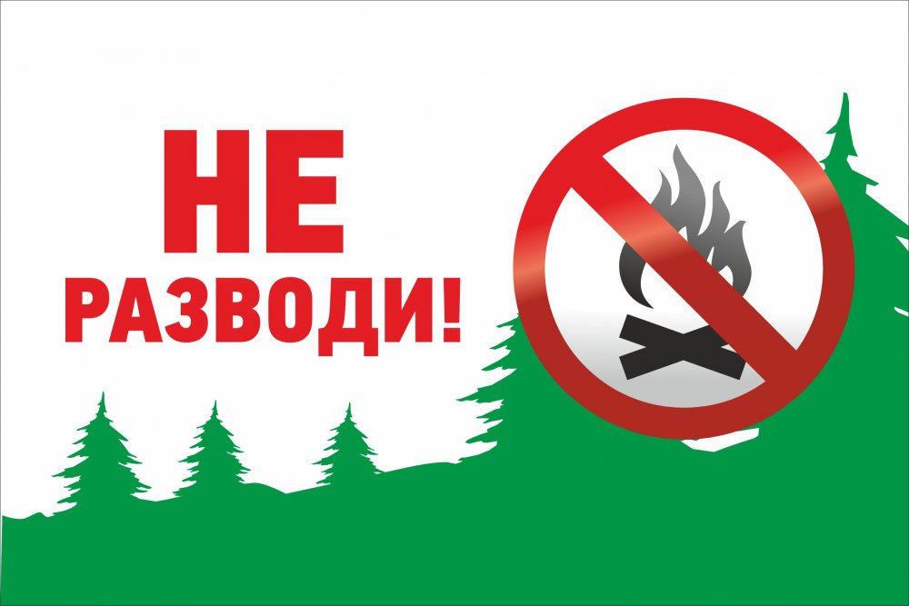 На аншлаге изображена надпись «Не разводи!» на фоне схематичного изображения елового леса и перечеркнутого пылающего костра – знака запрещающего разведение костров в лесу.