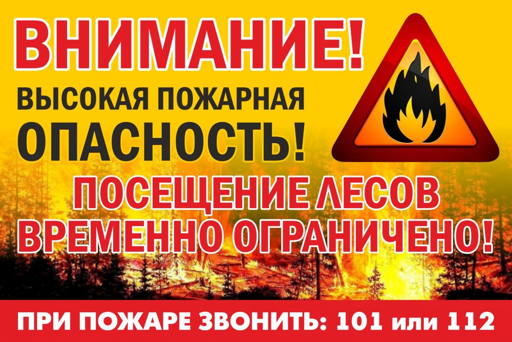 На аншлаге изображена надпись «Внимание! Высокая пожарная опасность! Посещение лесов временно ограничено!» на фоне горящего леса.