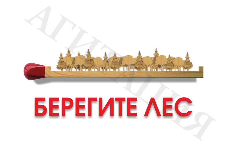 На аншлаге имеется надпись «Берегите лес» и изображение расположенной горизонтально спички с произрастающим на ней смешанным лесом, выполненными в единой цветовой гамме.