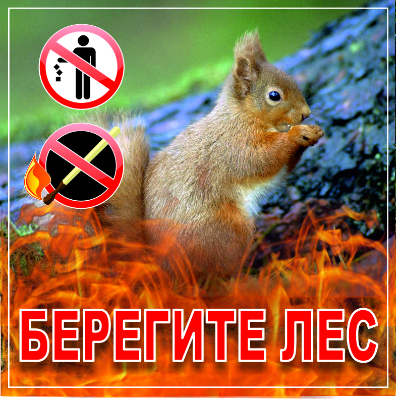 На аншлаге имеется надпись «Берегите лес от пожара» и изображения запрещающих разведение огня знаков (перечеркнутые горящая спичка и фигура человека бросающего горящую сигарету) на фоне подбирающегося к древесному стволу и белке пламени.