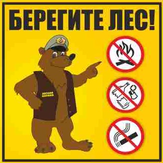 На аншлаге изображена надпись «Берегите лес!» на желтом фоне и мультипликационный медведь в жилетке «Forest guard» и форменной фуражке указывающий на запрещающие разведение огня знаки (перечеркнутый пылающий костер и горящая сигарета), а также на знак запрещающий мусорить в лесу.