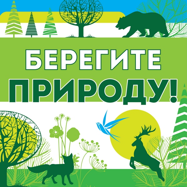 На аншлаге изображена надпись «Берегите природу!» на фоне беззаботно резвящихся в лесу животных: медведя, лося, лисицы и др.