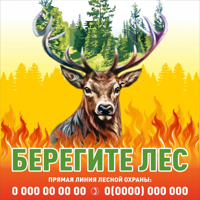 На аншлаге изображена надпись «Берегите лес», можно вписать номер прямой линии лесной охраны. На фоне горящего леса находится олень, в рогах которого раскинулся зелёный лес.