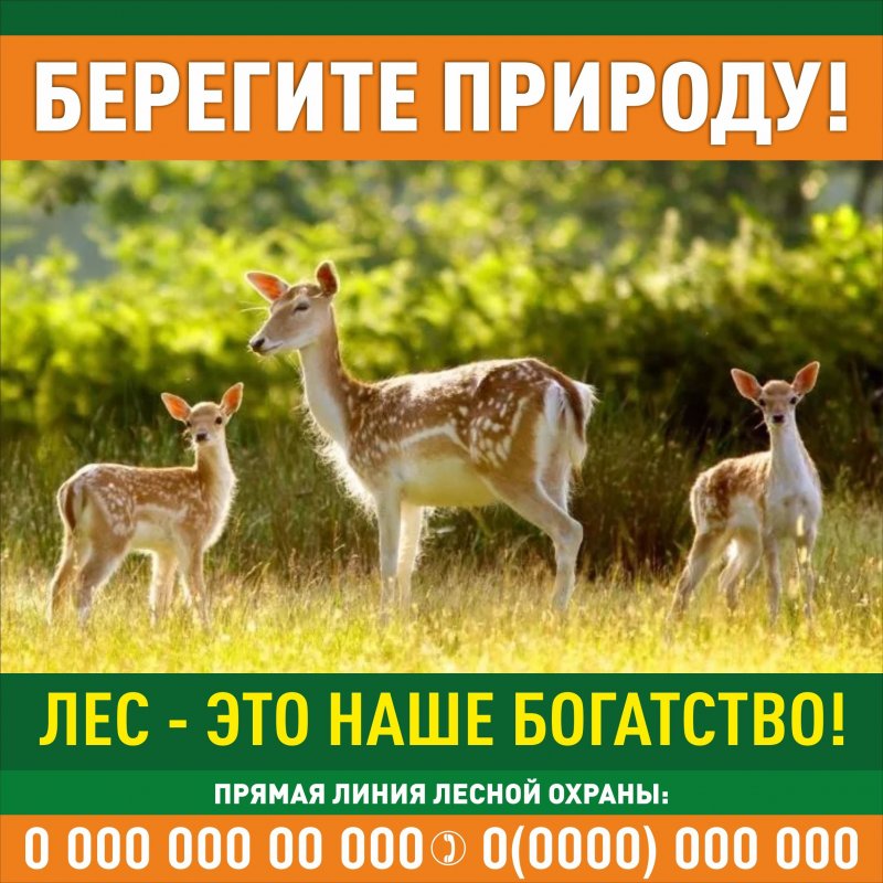 На аншлаге изображена надпись «Берегите природу! Лес - это наше богатство!», можно вписать номер прямой линии лесной охраны. На фоне зелёных кустарников стоят три пятнистых оленя.