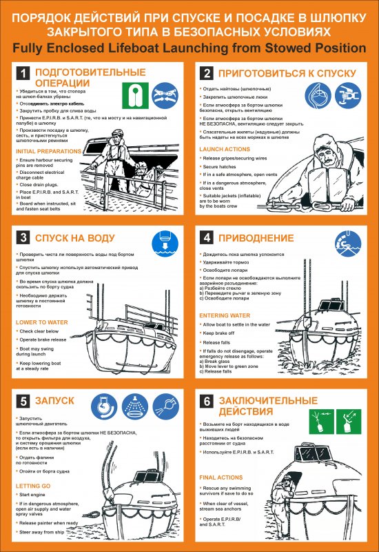 Плакат ИМО5 "Порядок действий при спуске и посадке в шлюпку закрытого типа в безопасных условиях". Формат: А3, А4.