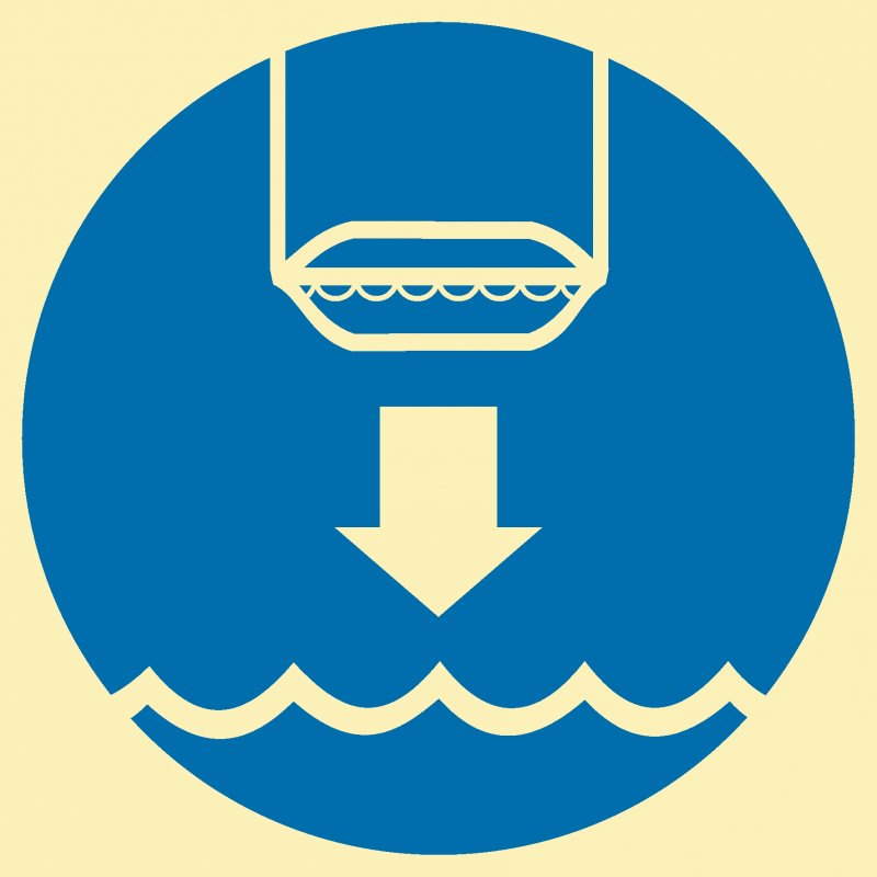 Знак IMO1.4 Спустите спасательную шлюпку. Размер: 150х150мм. Материал: Фотолюминесцентный пластик, фотолюминесцентная пленка