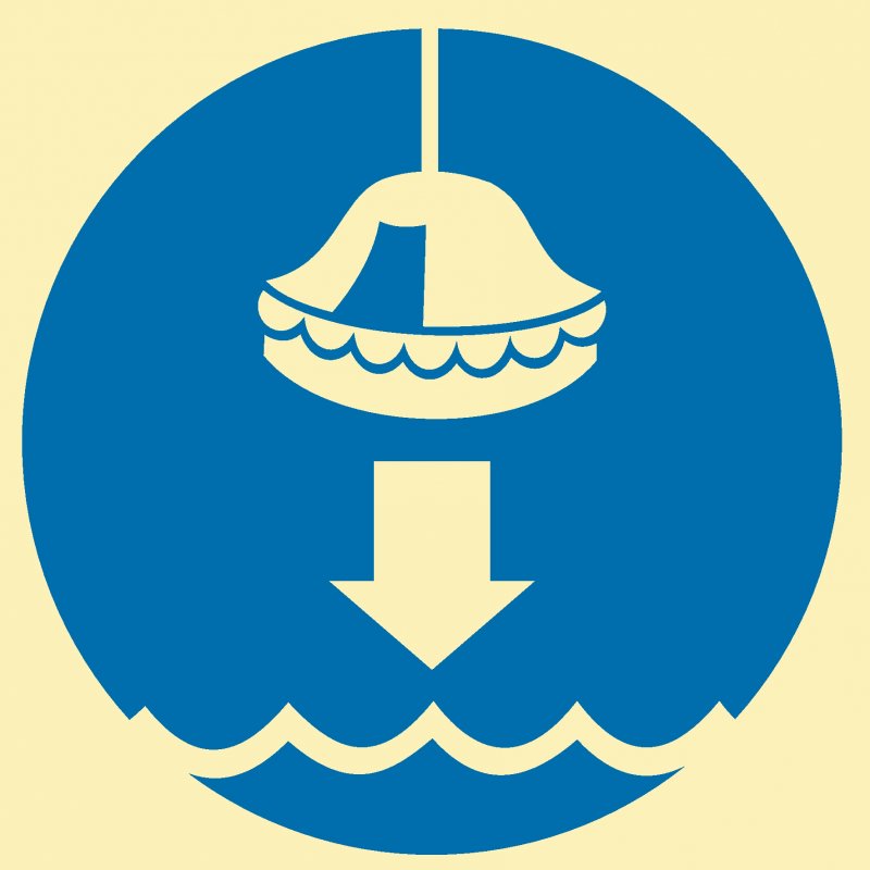Знак IMO1.5 Спустите спасательный плот. Размер: 150х150мм. Материал: Фотолюминесцентный пластик, фотолюминесцентная пленка.