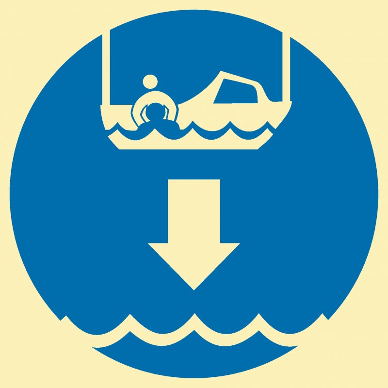 Знак IMO1.6 Спустите дежурную шлюпку. Размер: 150х150мм. Материал: Фотолюминесцентный пластик, фотолюминесцентная пленка