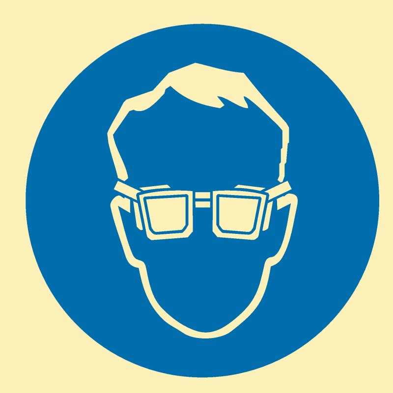 IMO4.4 Работать в защитных очках. Размер: 150х150мм. Материал: Фотолюминесцентный пластик, фотолюминесцентная пленка