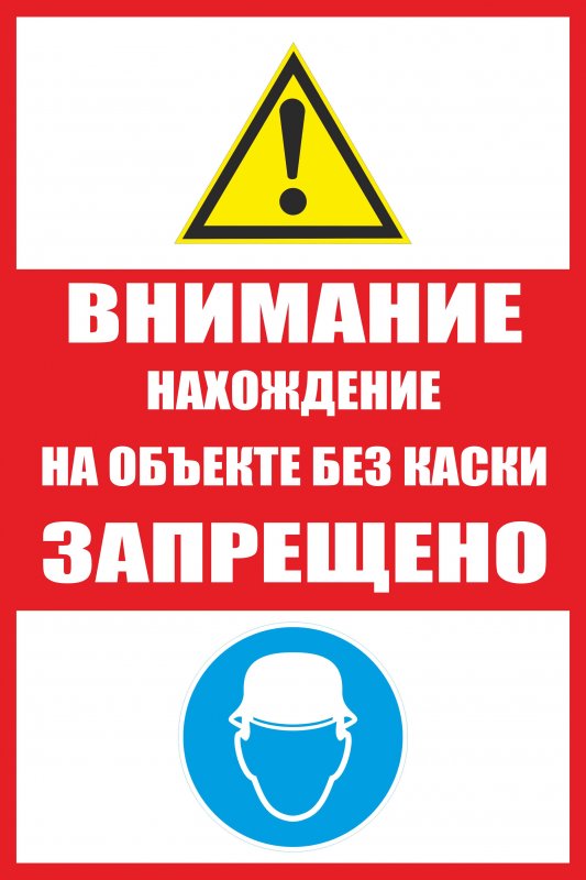 Табличка «Нахождение на объекте без каски запрещено!» напоминает о запрете нахождения на объекте без каски.