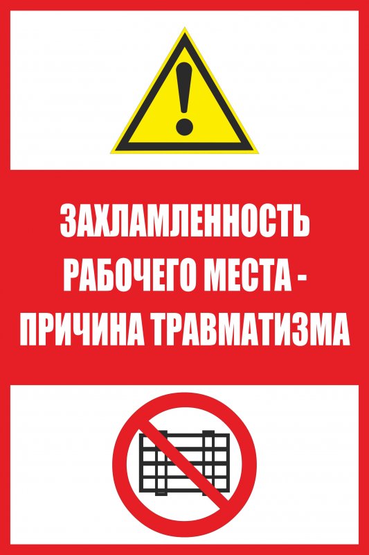 Табличка «Захламленность рабочего места причина травматизма» напоминает о том, что захламленность рабочего места, является причиной травматизма.