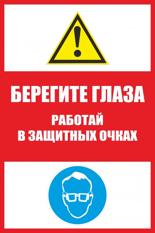Табличка «Берегите глаза. Работай в защитных очках» напоминает необходимости работать в защитных очках, чтобы сберечь глаза и не потерять зрение.
